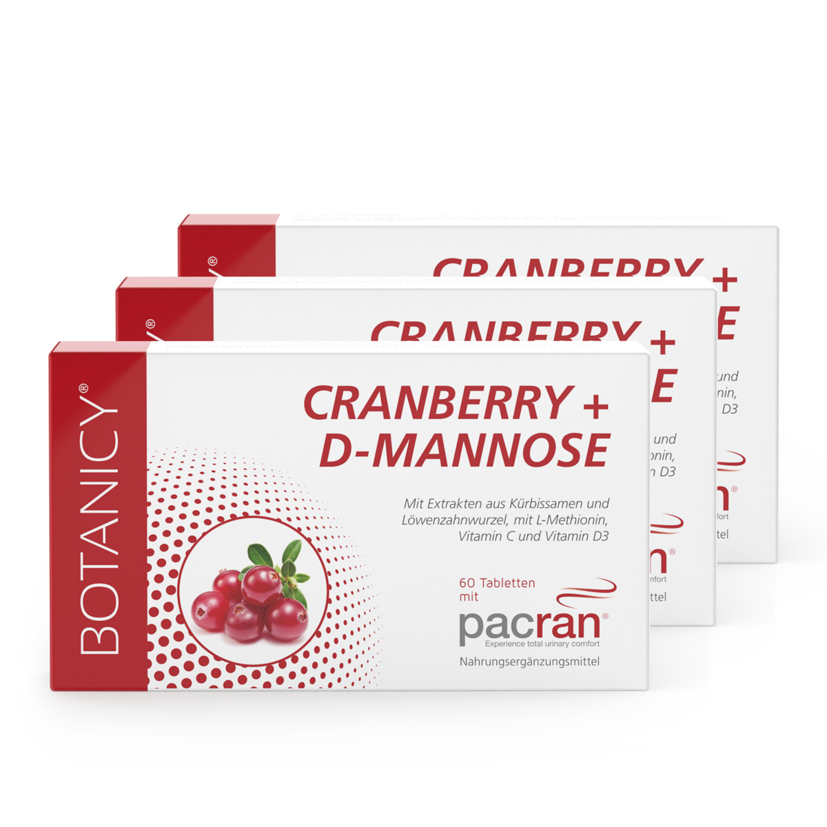 CRANBERRY + D-MANNOSE ist der praktische 7-in-1-Komplex aus hochwertigem Cranberrypulver des Markenrohstoffs PACRAN®, kombiniert mit D-Mannose, Extrakten aus Kürbissamen und Löwenzahnwurzel, der Aminosäure L-Methionin sowie den Vitaminen C und D3.